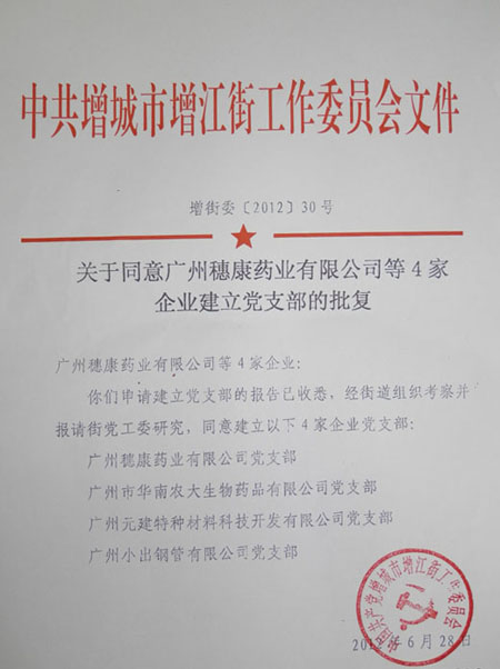 增江街黨工委相關(guān)領(lǐng)導(dǎo)在2012年7月2日蒞臨我司進(jìn)行揭牌儀式,宣告廣州市華南農(nóng)大生物藥品有限公司黨支部正式成立。