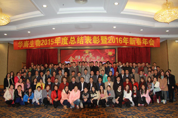 2016年1月13日下午,廣州市華南農大生物藥品有限公司2015年總結表彰暨2016年新春年會在廣州市增城區百花山莊酒店隆重舉行。