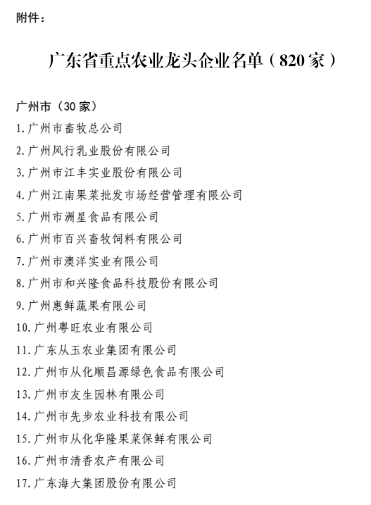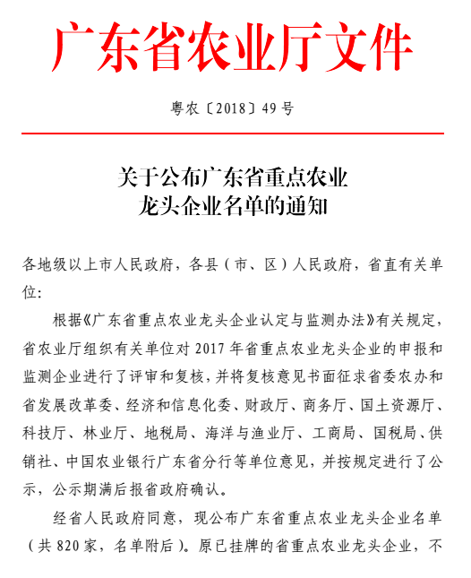 近日,廣東省農(nóng)業(yè)廳下發(fā)粵農(nóng)【2018】49號文件關(guān)于公布廣東省重點農(nóng)業(yè)龍頭企業(yè)名單的通知,廣州市華南農(nóng)大生物藥品有限公司晉升為廣東省重點農(nóng)業(yè)龍頭企業(yè),此次廣東省有820家企業(yè)獲此殊榮,其中廣州市企業(yè)有30家。
