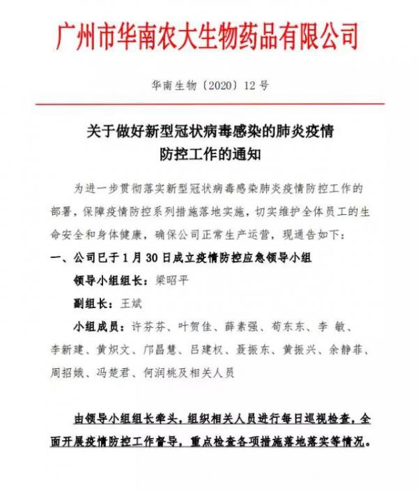 為了抗擊疫情,做好全面防范工作,公司積極響應(yīng)國(guó)家號(hào)召,緊急發(fā)布落實(shí)做好新型冠狀病毒感染的肺炎疫情防控工作的通知。第一時(shí)間組成由梁昭平總經(jīng)理領(lǐng)導(dǎo)下的“華南生物疫情防控應(yīng)急領(lǐng)導(dǎo)小組”及各個(gè)專項(xiàng)小組,全方位指導(dǎo)員工投入有序的防控工作當(dāng)中,切實(shí)做好重大疫情疫病的防控工作。