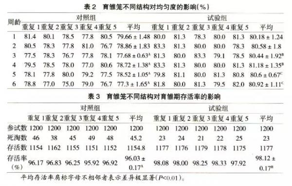 3.2 育雛籠不同結(jié)構(gòu)對(duì)育雛期均勻度和存活率的影響