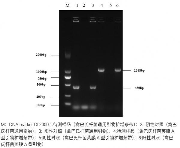 用莢膜分型引物進(jìn)行PCR擴(kuò)增,結(jié)果顯示為A型多殺巴氏桿菌陽(yáng)性。凝膠圖片如下: